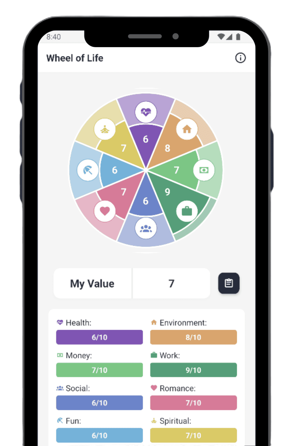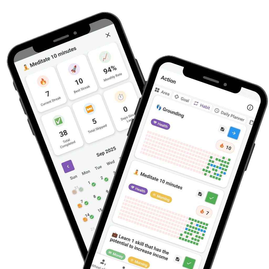 Get a clear visual overview of your life balance with the Wheel of Life. By rating eight key areas — Health, Environment, Money, Work, Social, Romance, Fun, and Spiritual — you can easily see where you’re doing well and where improvement is needed. This feature helps you identify neglected areas and set the right priorities to enhance your overall quality of life.
