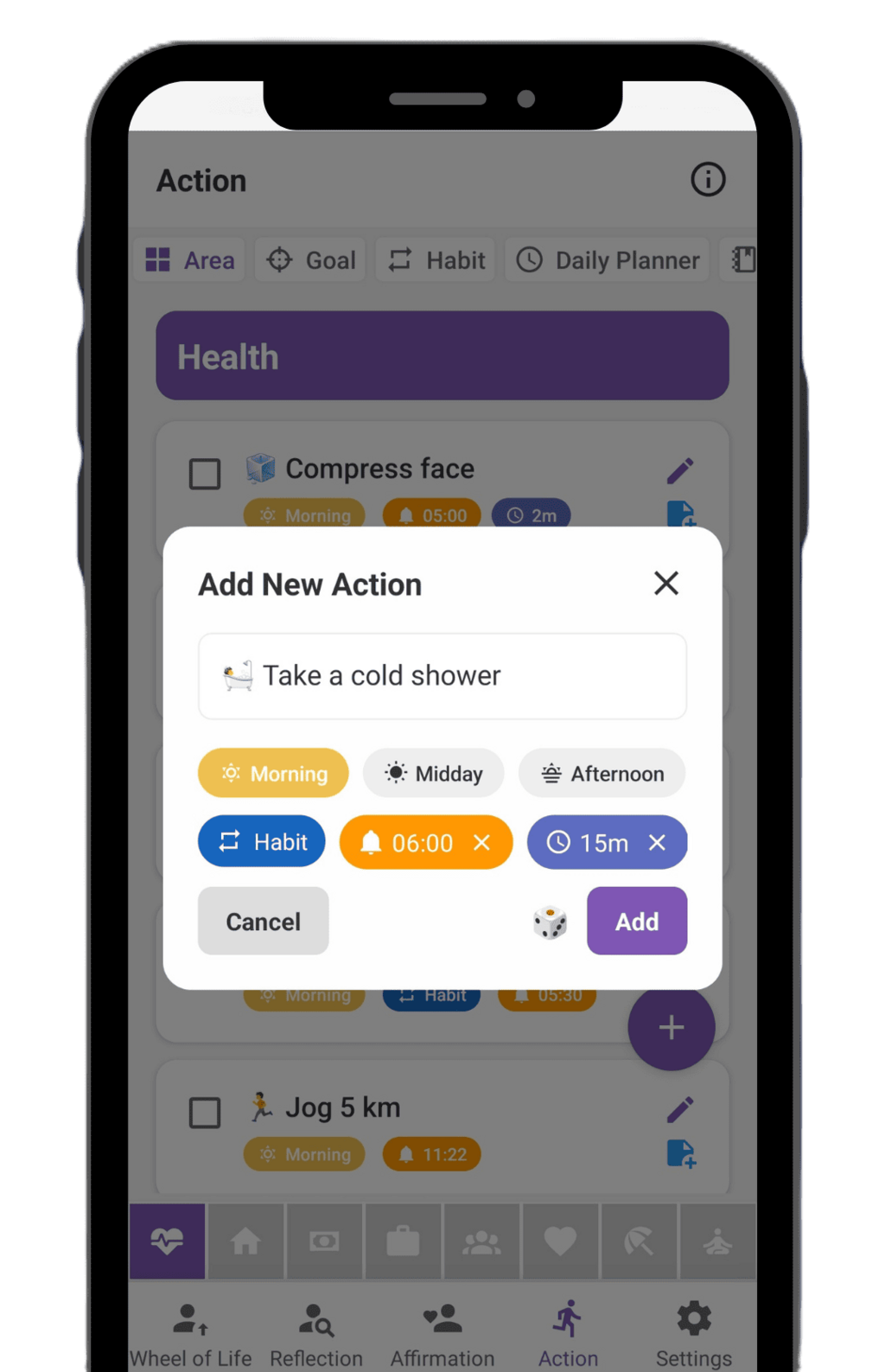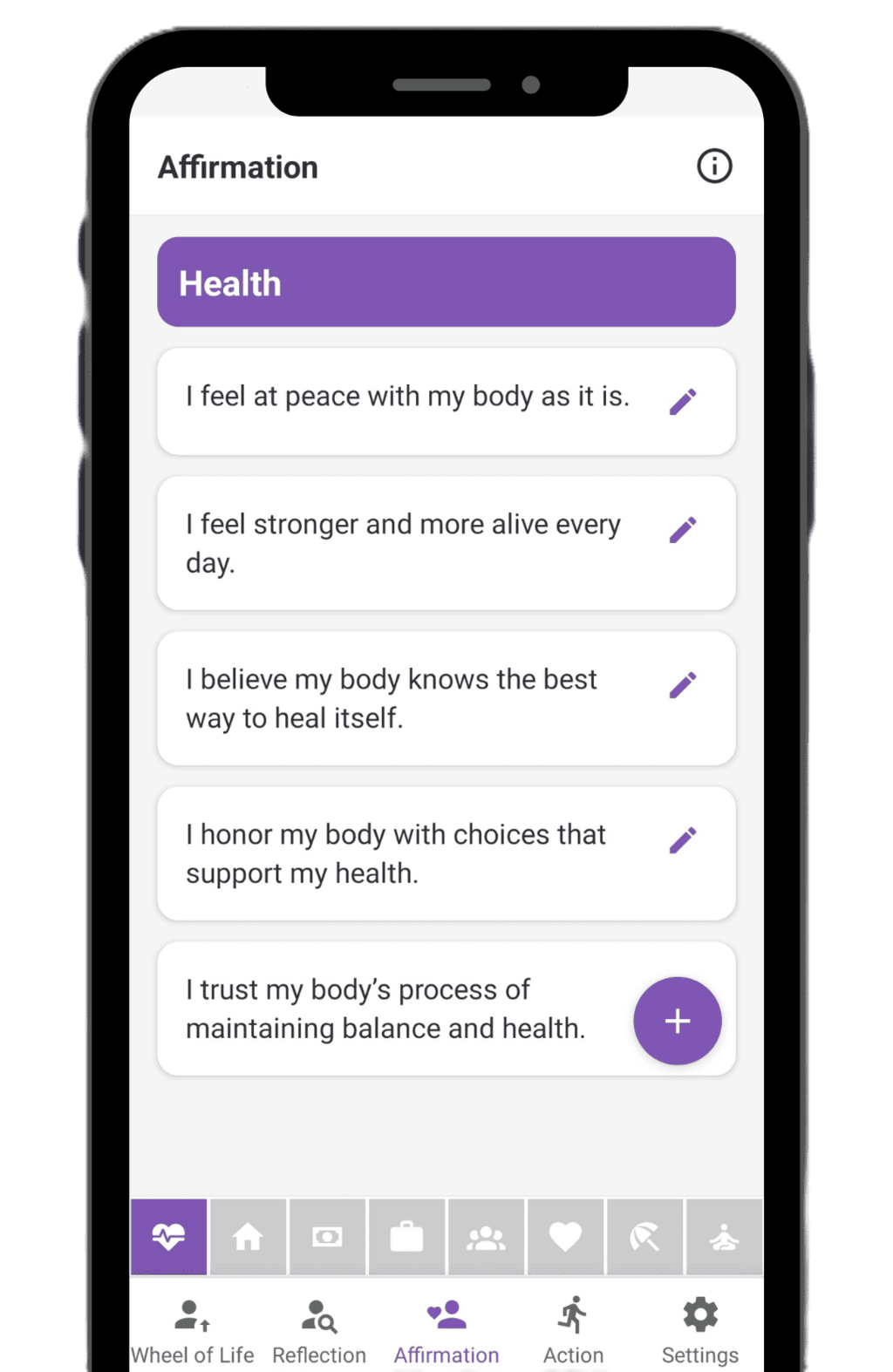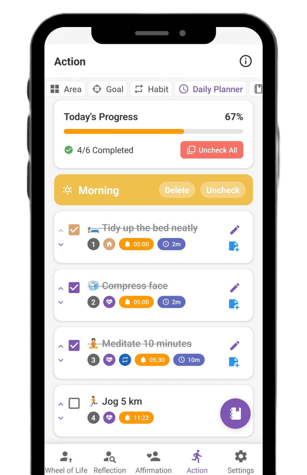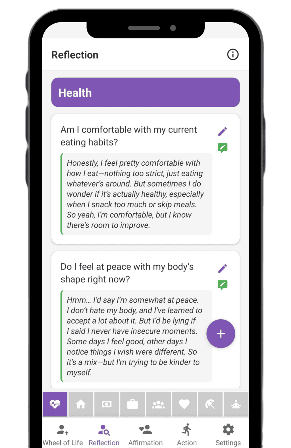 Take a moment to pause and reflect. The Reflection feature provides meaningful, thought-provoking questions for each area of life, designed to help you increase self-awareness of your mindset, habits, and emotions. By answering these questions regularly, you’ll gain valuable insights, make wiser decisions, and cultivate gratitude in your daily life.