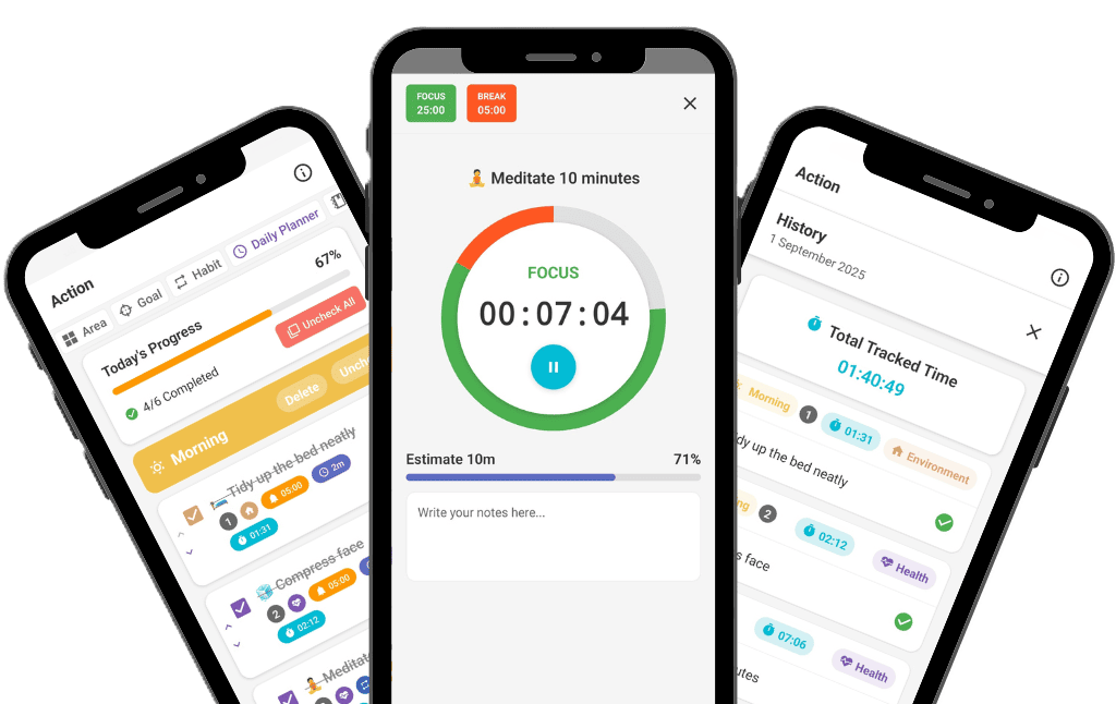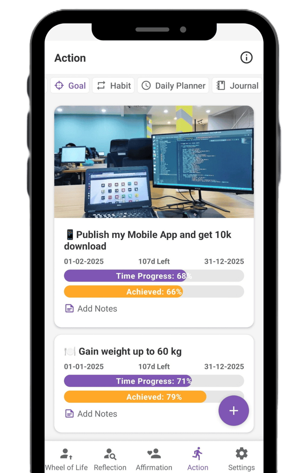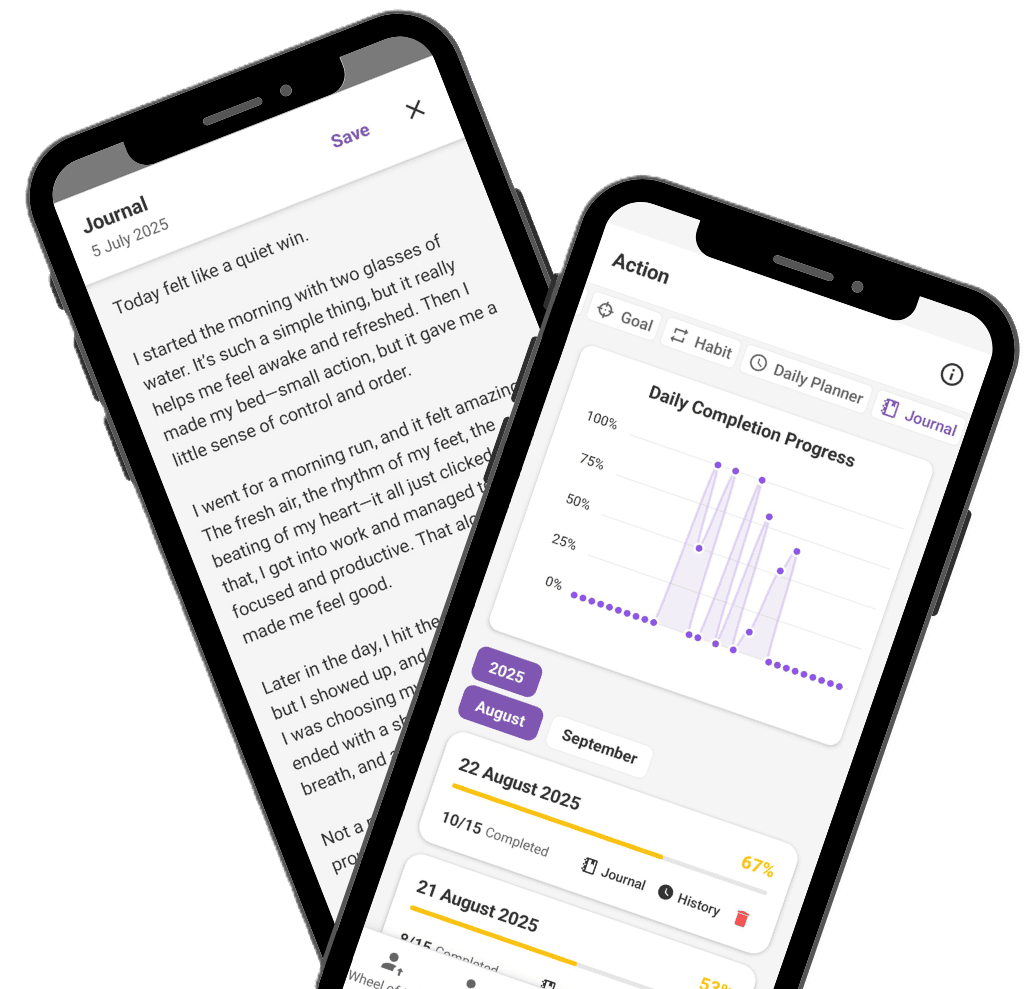 Turn your reflections and affirmations into real actions. The Action feature helps you break down your goals into small, specific, and measurable steps that you can apply day by day. Each task can be prioritized, making the journey toward your bigger goals more manageable and structured. This way, you’re not just dreaming, you’re actively moving forward — one step at a time.